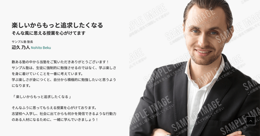 まず画像についてですが、あくまで参考とし、実際に公開されるサイトに合った画像に必ず差し替えてください。そしてテキストはある程度使っていただいても構いませんが、オリジナルのものにアレンジしていただくのが理想的です。